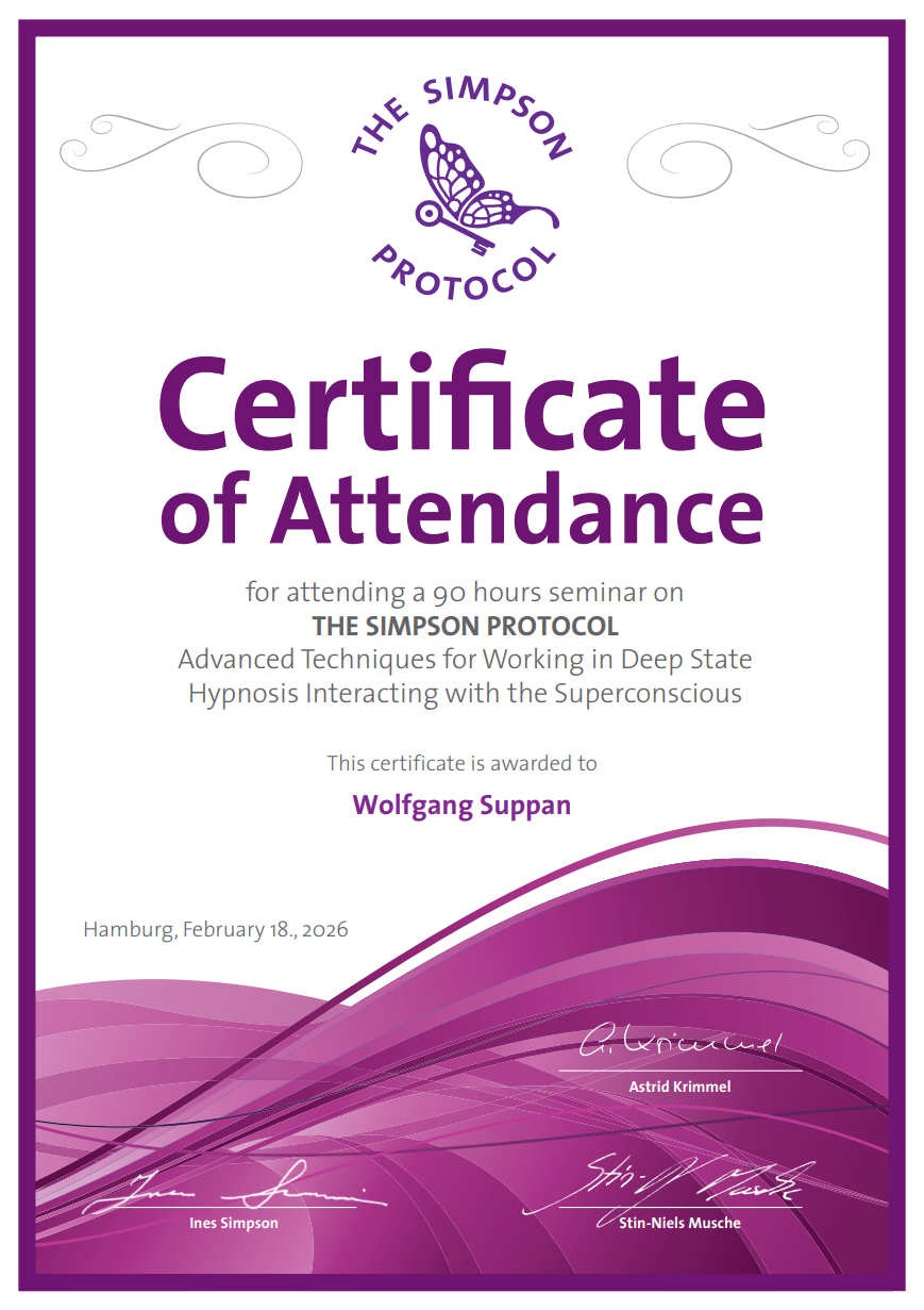 Ich wurde persönlich von Ines Simpson in dieser Originalmethode ausgebildet und arbeite methodentreu nach ihren Richtlinien. Als einer der wenigen spezialisierten Anwender des Simpson Protocols in Österreich biete ich diese Form der Hypnosearbeit nahezu exklusiv bei Hypnosepoint an.